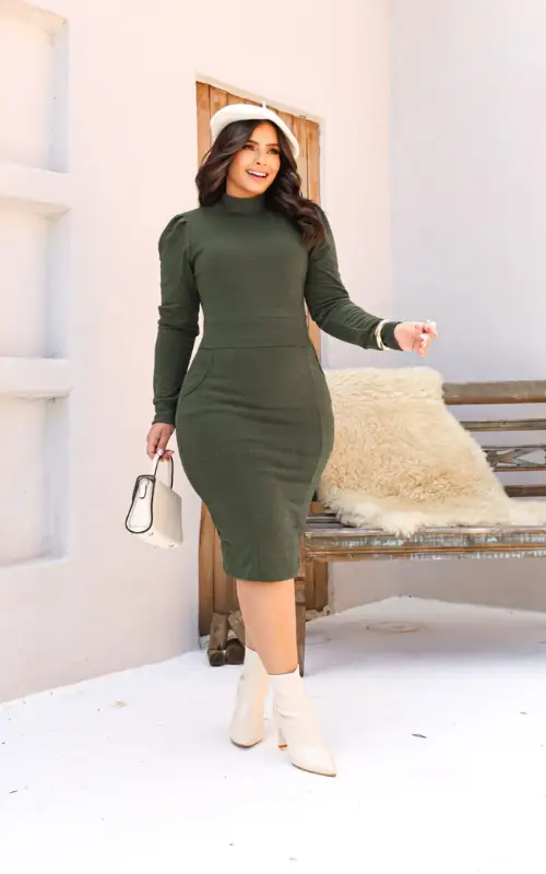 Vestido Midi Verde Militar Feminino – Manga Longa, Gola Alta e Modelagem Justa